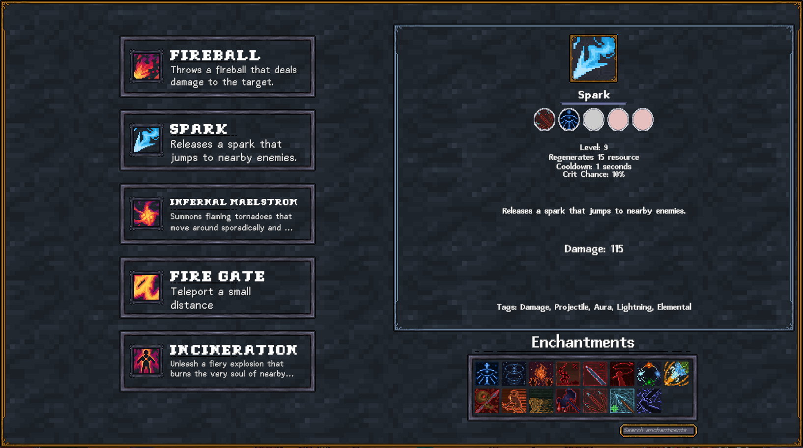 Enchant your abilities to enhance them with different effects. Choose from a large range of enchantments from multiple projectiles to special casting conditions. Take your abilities to new heights.
